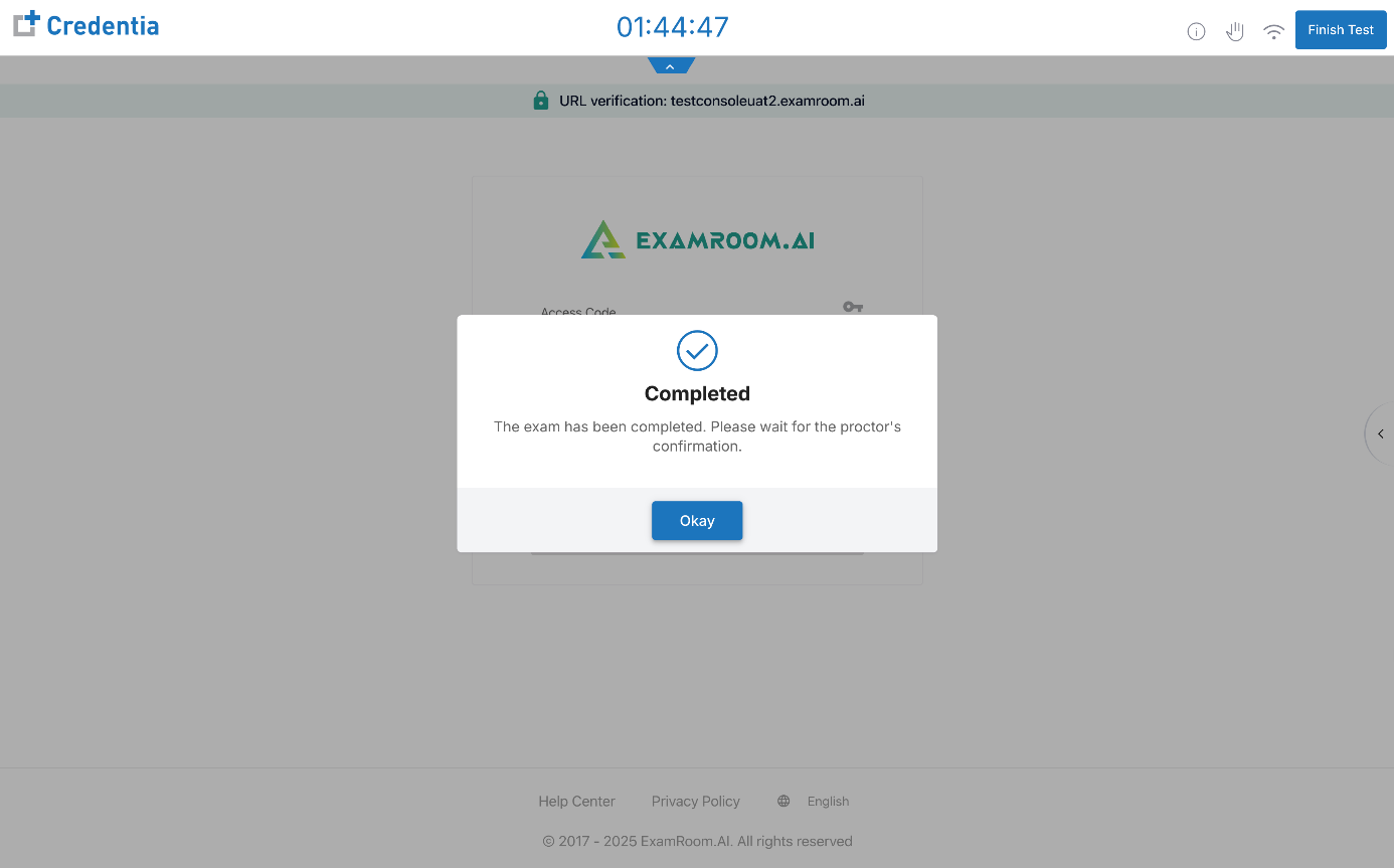 - After completing the exam, click Okay and wait for the proctor to confirm and end the session, and once confirmed, the test console window will be automatically closed, and you will return to your dashboard.