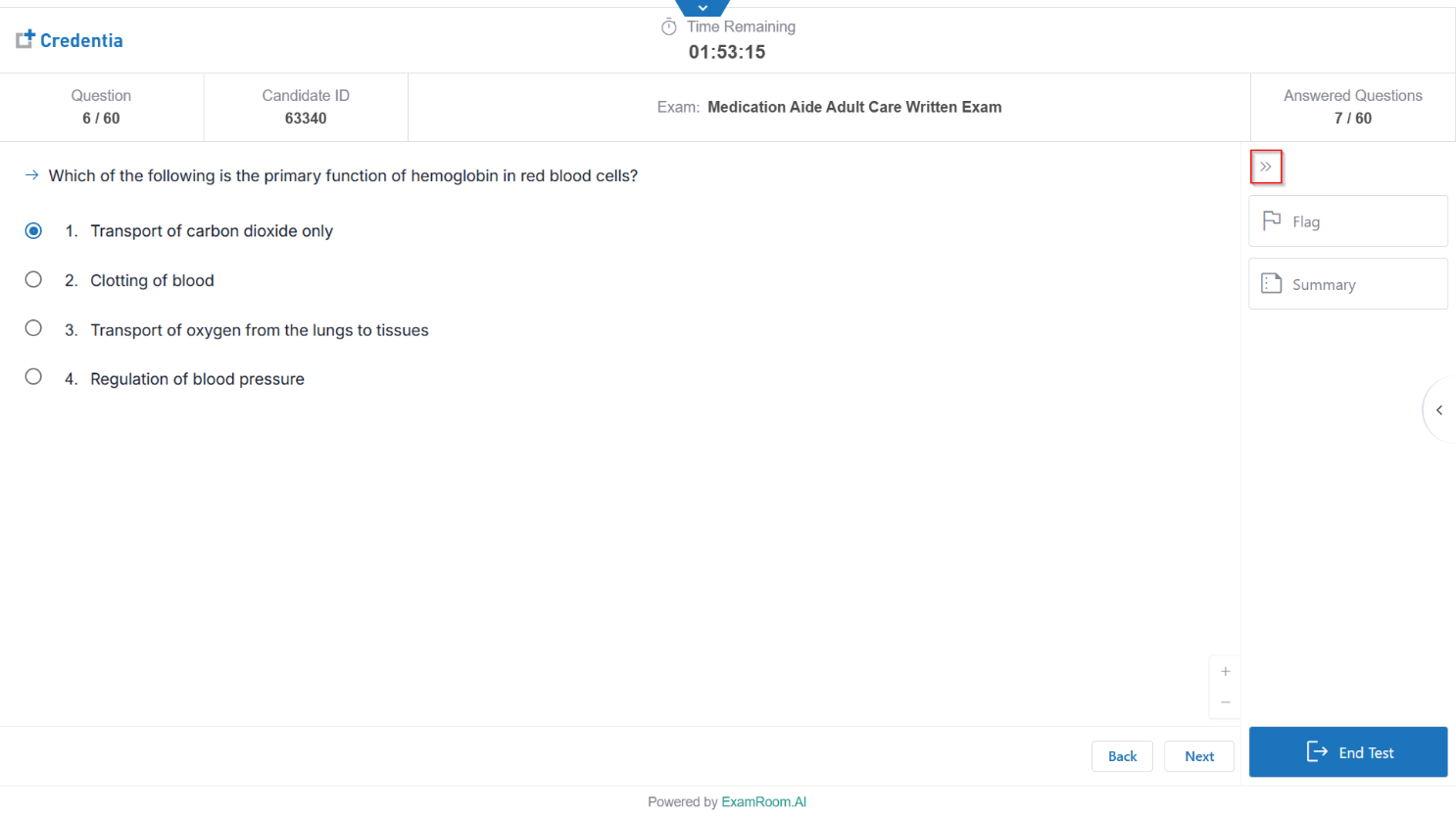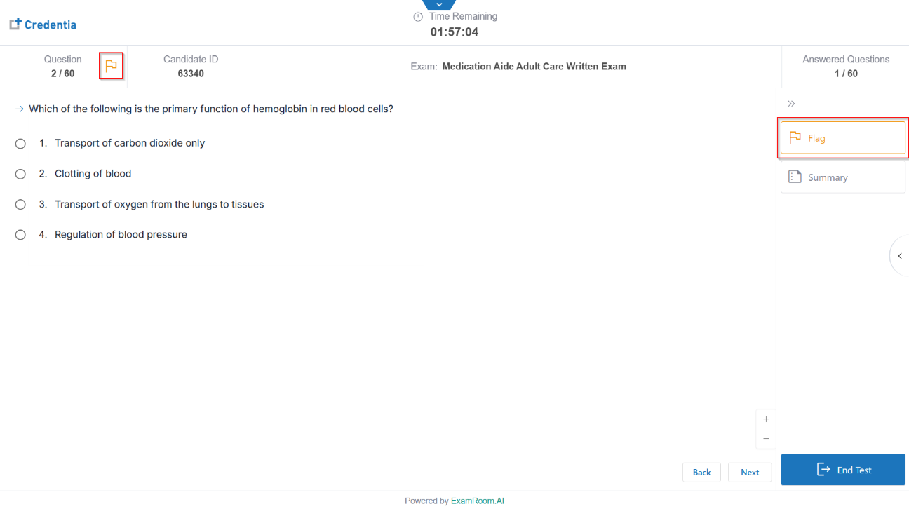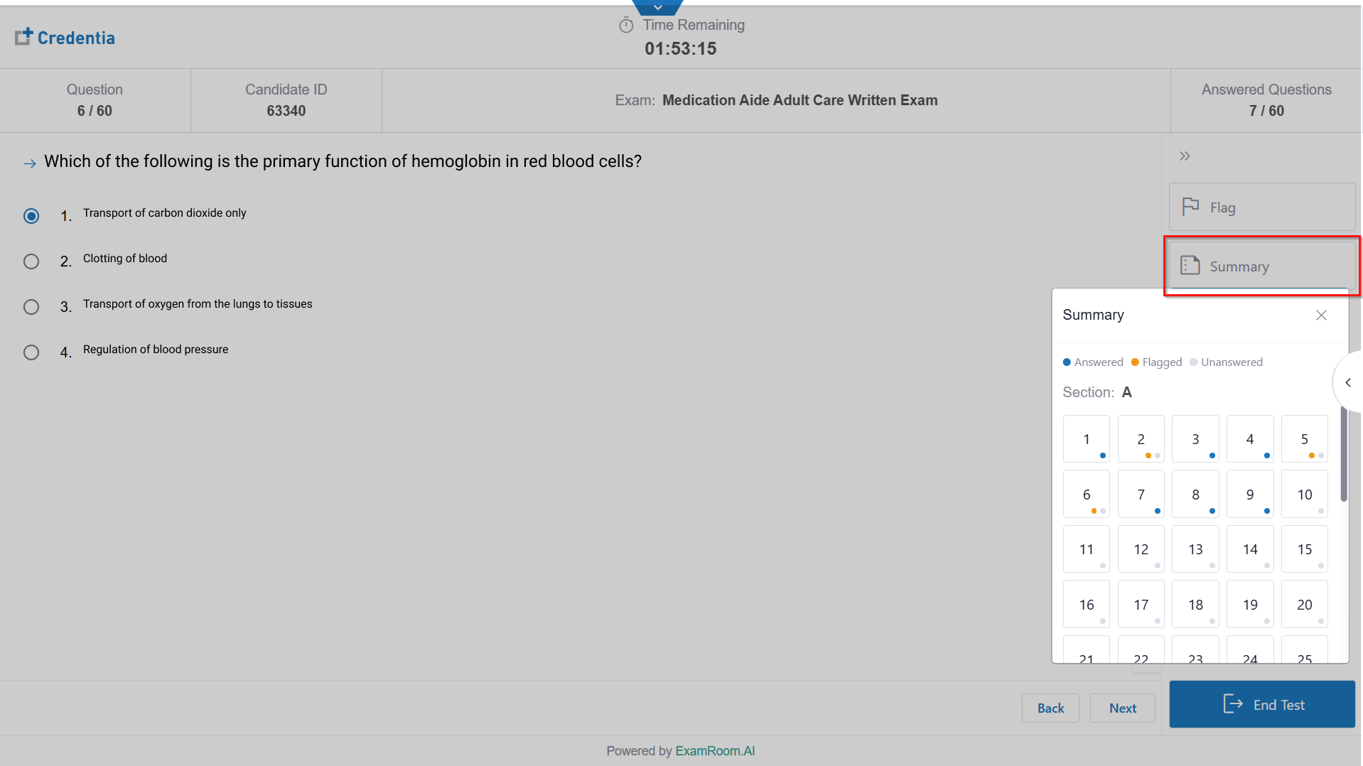 - Click Summary to review exam progress and flagged items/questions.