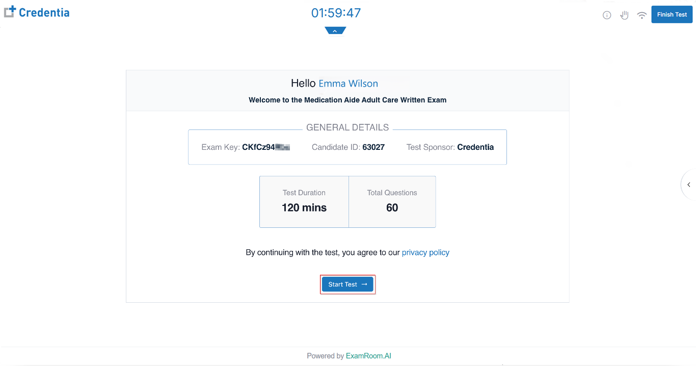 - When the test login screen appears, please wait for the proctor to complete the Access Code, Exam Key, and Candidate ID fields. The proctor will then enable access to your exam.