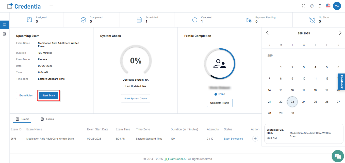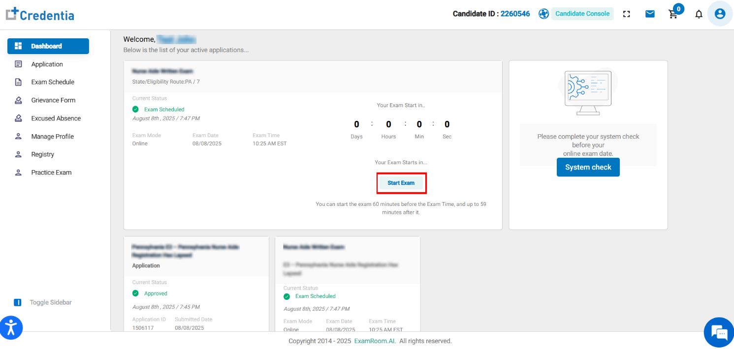 From the Candidate Dashboard, please follow the steps below to start the online exam: