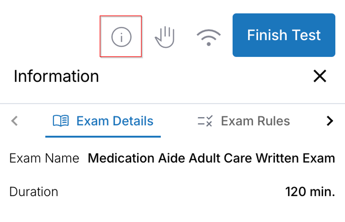 - Information icon (you can view exam details, Exam Rules, and Instructions mentioned for your exam).