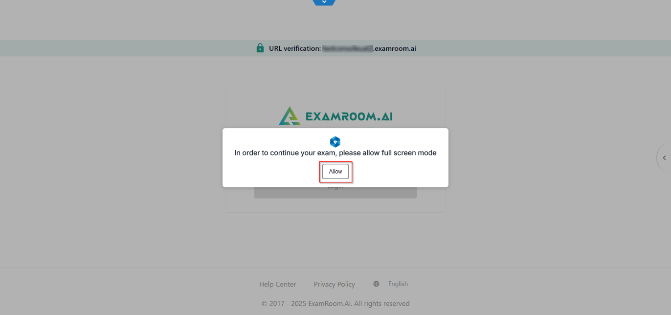 - After being connected to the proctor, the test console screen will appear. A pop-up will prompt you to enter full-screen mode. Click Allow to continue.