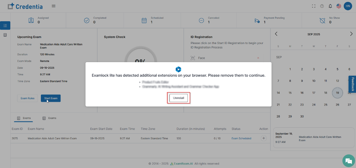 - Once the extension is installed. Click the Start Exam button again and proceed.