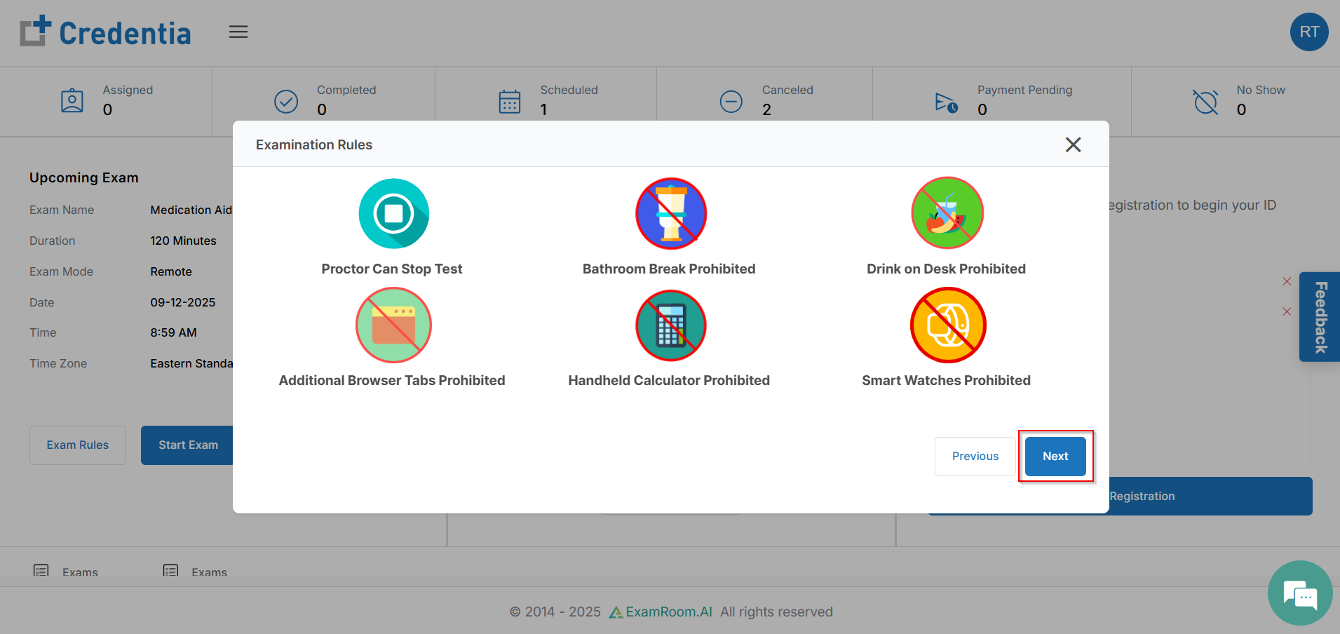 - Review the exam rules and then click Next to proceed.