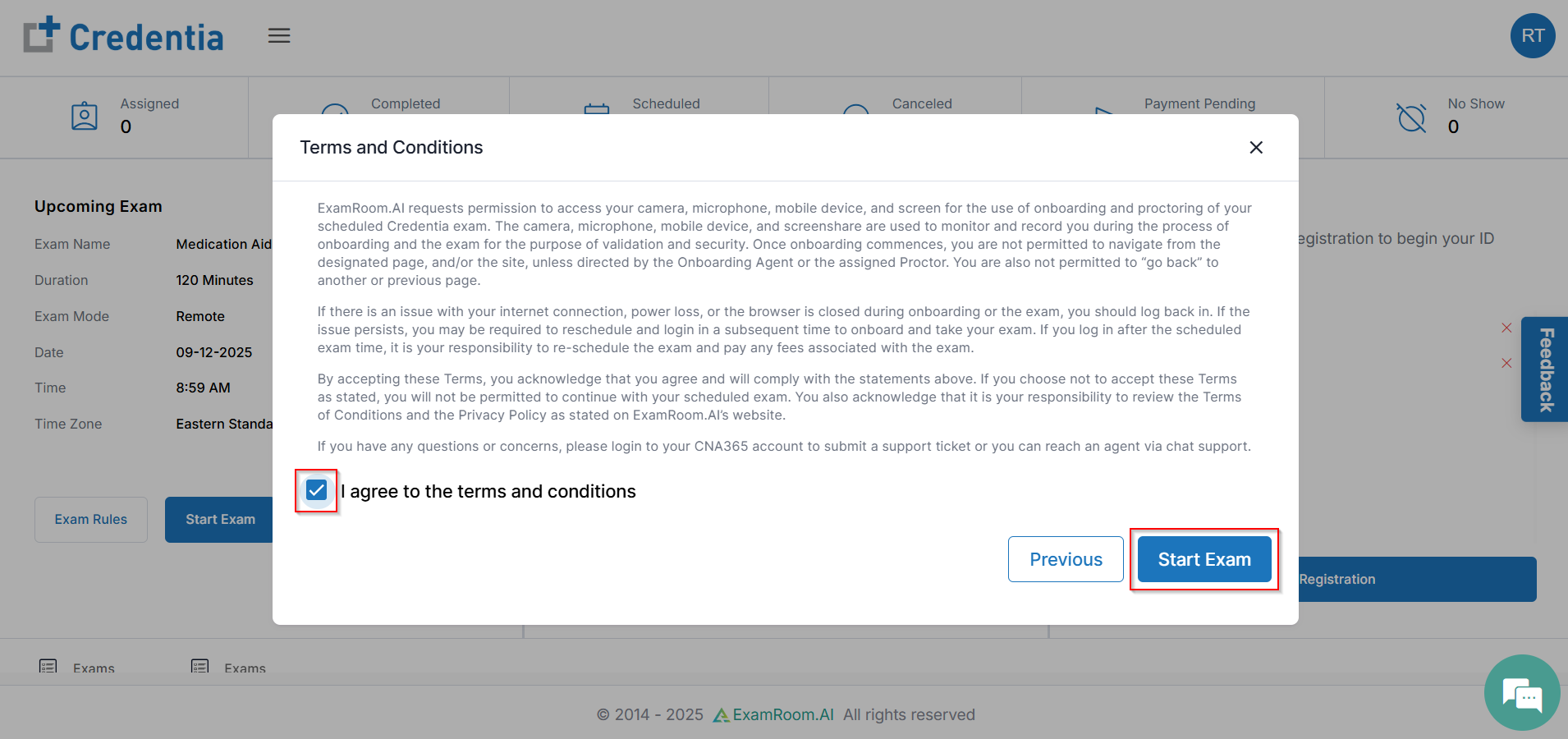 - Please review the Terms and Conditions statement and click the I agree to the Terms and Conditions box, then click Start Exam.