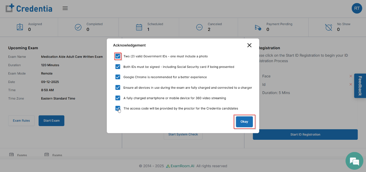 - Click the check boxes to acknowledge that you are prepared for the online exam and then click Okay to continue.