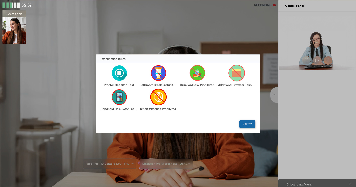 - After the room scan is complete, you will review the exam rules. When you are done reviewing the rules, click Confirm.