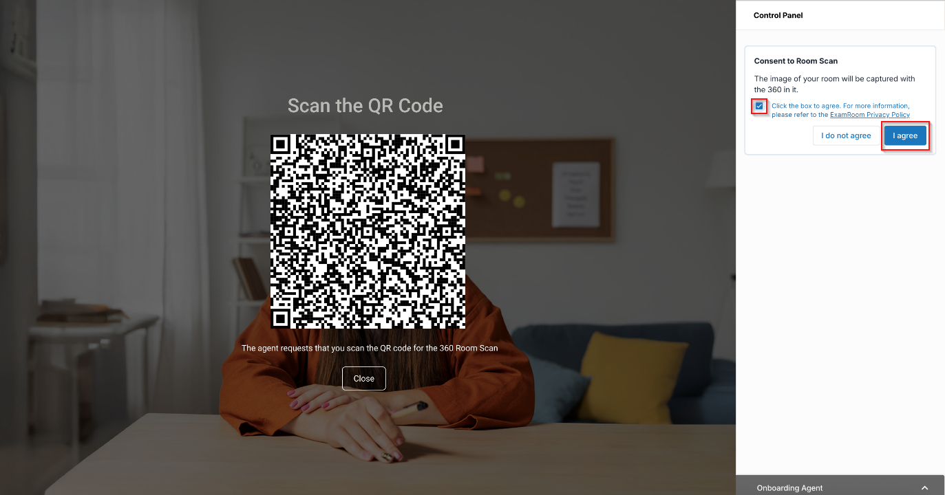 - To initiate the Room scan and Exam 360 view using your Android/iPhone, click the check box to provide consent, then click the I agree button in the Control Panel on the right-hand side of the screen.