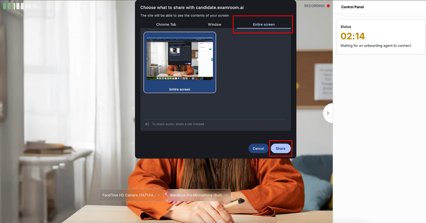- Select the Entire Screen option, click the entire screen image in the box, and then click Share to share your entire screen with the OBA and proctor.