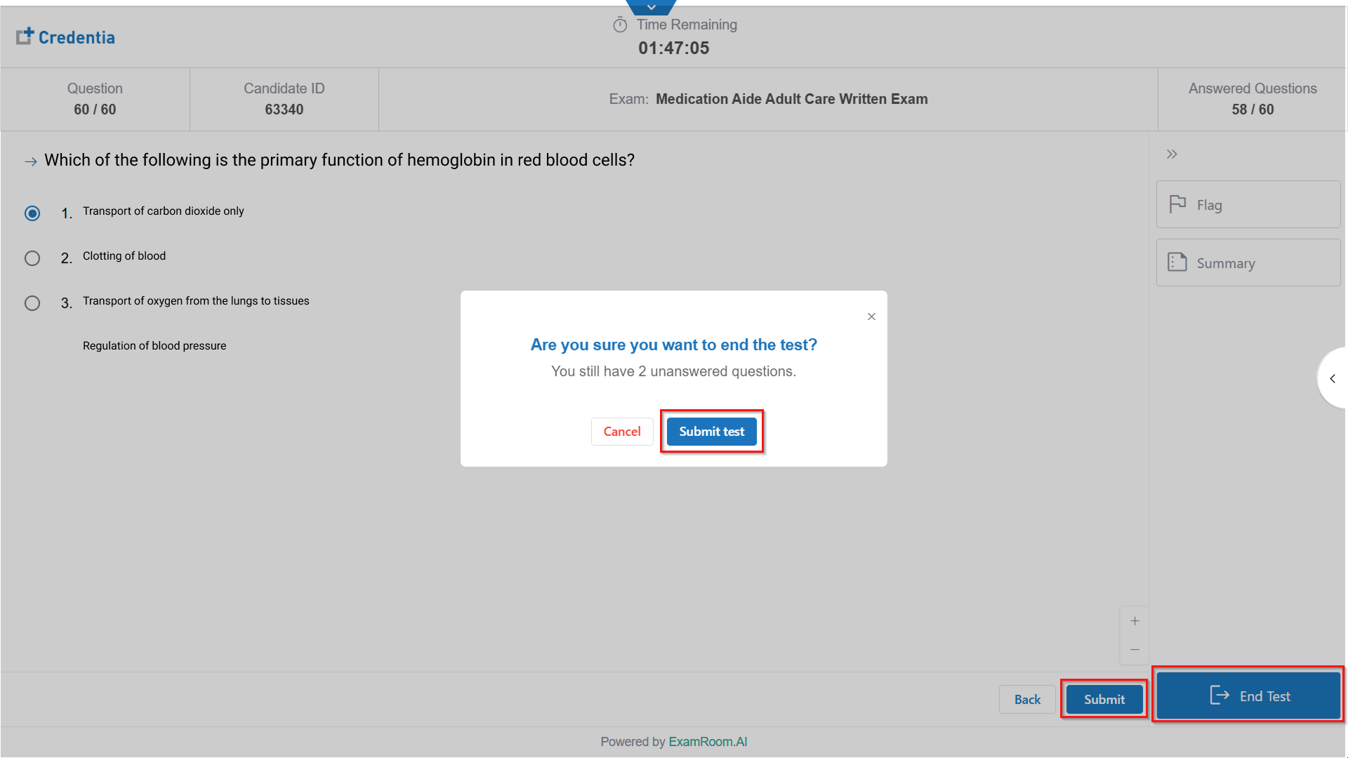 Note: Keep an eye on the answered question, count in the top info bar, or refer to the summary for a quick overview. When you finish your test, the confirmation box will indicate whether you have any unanswered questions. - After clicking Submit/End Test, click Submit Test to confirm the submissions. Otherwise, click Cancel to return to the exam.