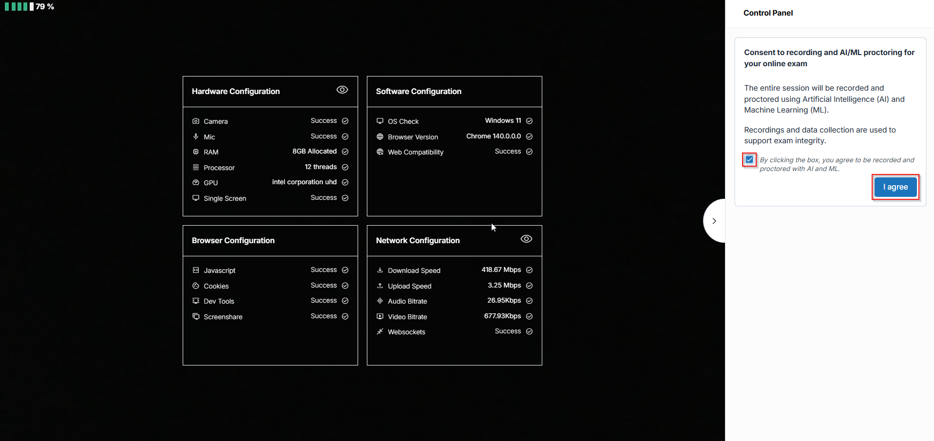 - After clicking the Start Exam button, you will be directed to a system check that will analyze the hardware, software, browser, and network system configurations. When completed, click the box to provide consent for recording and AI/ML proctoring, then click the I agree button.