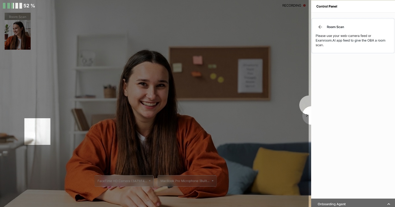 - You will be connected to a video stream through your smartphone to provide a room scan. Follow the instructions provided by the OBA and show your testing area and the room using your Exam 360 device.