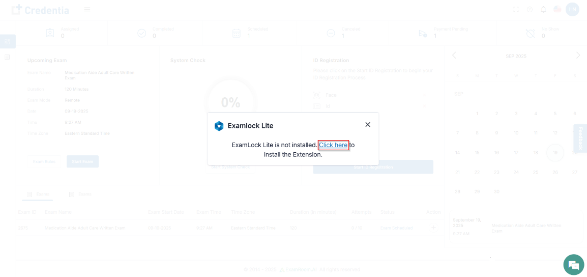 - If you have not installed the Examlock Lite extension, you will get a pop-up to install the extension before proceeding to start the exam. Make sure you install and proceed with your exam.