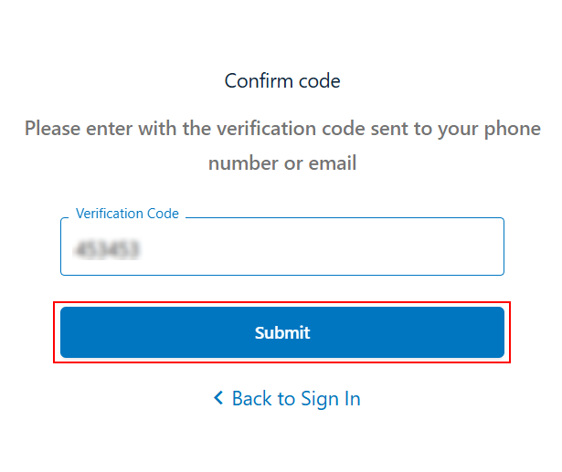 - Enter the OTP in the verification code field and click Submit.