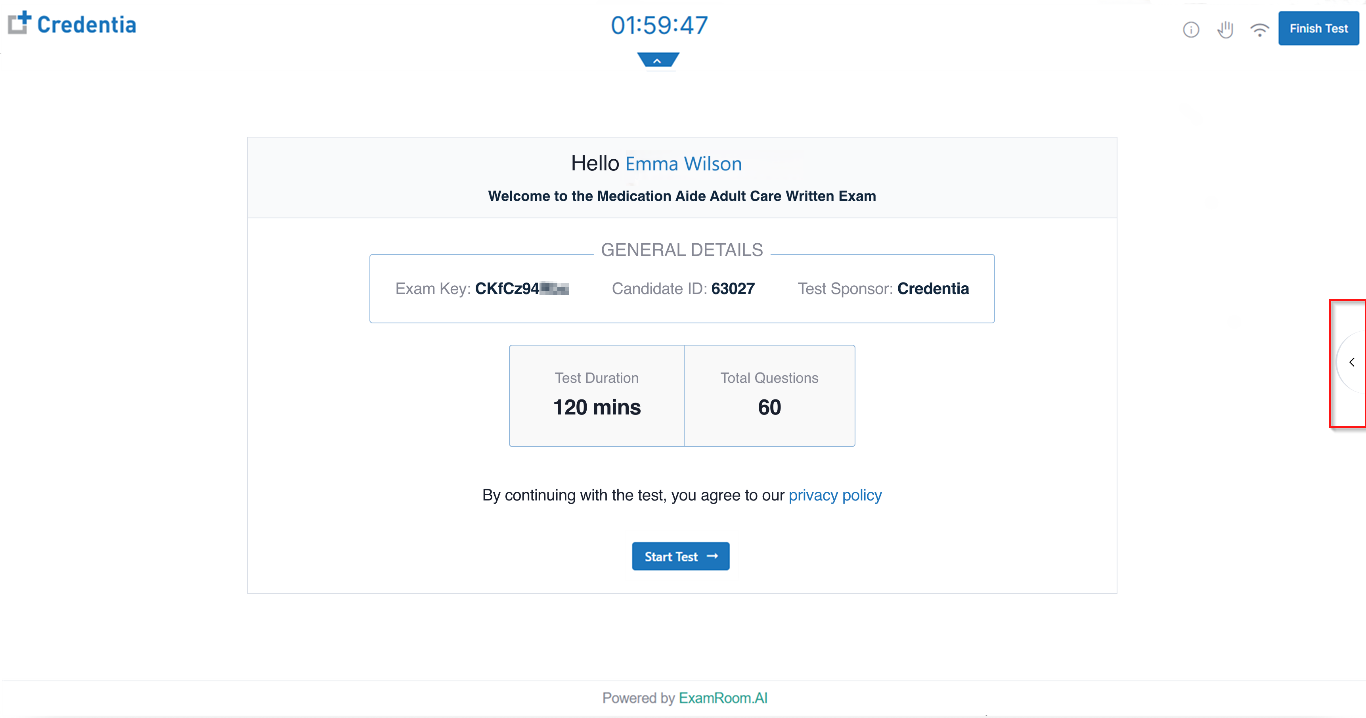 - The Welcome Screen appears, displaying the exam details. Click the arrow icon on the right-hand side to chat with the proctor during your exam.